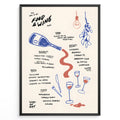 Minimalist hand-drawn food and wine menu illustration with bottles and glasses—modern kitchen wall art print.