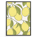 Botanical poster featuring yellow lemons with green leaves on white background, framed in black.
