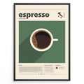 Load image into Gallery viewer, Minimalist espresso poster with a top-view coffee cup on a green background and modern typography.