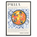 Watercolor paella wall art showing seafood, rice, and mussels on blue patterned tiles, framed in black, ideal for Spanish kitchen or restaurant wall decoration.