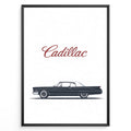 Minimalist side profile illustration of a classic Cadillac car with “Cadillac” text above in a framed poster.
