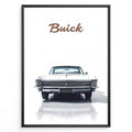 Front view illustration of a classic white Buick Riviera car on a minimalist poster.