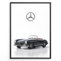 Framed minimalist poster featuring a black Mercedes-Benz 300SL Roadster convertible with red seats and Mercedes logo above on white background.