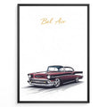 Framed poster of a red Chevrolet Bel Air classic car with “Bel Air” text in gold on a white background.