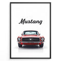 Framed poster of a red classic Ford Mustang front view with the word “Mustang” written above.