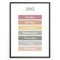 Load image into Gallery viewer, Pastel-colored days-of-the-week poster showing Sunday to Saturday in soft color blocks, framed as children’s educational wall art.