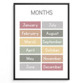 Load image into Gallery viewer, Pastel-colored months-of-the-year poster showing January through December in soft color blocks, framed as children’s educational wall art.