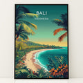 Bali Vintage Travel Plakat | Vintage Travel Poster | Denne plakat viser en tropisk strandscene med turkisfarvet vand, frodig grøn natur og palmer. Perfekt til dem, der elsker eksotiske rejsemål.
