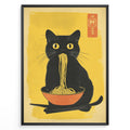 Japanske plakater | Illustration of a black cat with yellow eyes eating noodles from an orange bowl, set against a yellow background with Asian characters in the corner.