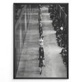 Fashion Plakat | Black & White Fashion Runway – Editorial Wall Art Print Plakaty.dk | Black and white photograph of runway models walking in a single-file line during a fashion show, with seated spectators on one side of the runway.