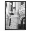 Fashion Plakat | Chanel Boutique Exterior – Monte Carlo, Monaco Plakaty.dk | Black and white photo of the Chanel storefront in Monte Carlo, Monaco, showcasing ornate architecture with columns, balconies, and a hanging sign.