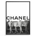 Fashion Plakat | CHANEL Newspaper Bench – Fashion Art Poster Plakaty.dk | Black and white fashion poster of four women sitting on a bench reading newspapers, with the bold text "CHANEL" across the top half of the image.
