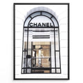 Fashion Plakat | Chanel Storefront Window – Fashion Photography Print Plakaty.dk | Photograph of a Chanel boutique storefront window with elegant black framing and luxury fashion items on display.