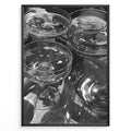 Fashion Plakat | Cheers in Black & White: Luxe Champagne Coupes Wall Art Plakaty.dk | Black and white photo of multiple champagne coupe glasses being raised in a celebratory toast, reflecting light and bubbles.