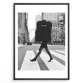 Fashion Plakat | Chic Chanel Street Style Fashion Print Plakaty.dk | Black and white photo of a stylish woman in heels crossing a city street while carrying a Chanel garment bag, framed as wall art.