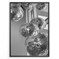 Fashion Plakat | Cluster of Disco Balls in Natural Light Plakaty.dk | Black and white photo of multiple hanging disco balls reflecting natural light near large windows