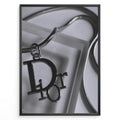 Fashion Plakat | Dior Pendant Necklace – Elegant Black & White Fashion Print Plakaty.dk | Black and white close-up image of a Dior pendant necklace with a metallic chain, showcasing luxury jewelry on a textured background.