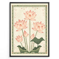 Plakater | Illustration of pink lotus flowers with green stems and leaves, framed by a decorative green floral border on a cream textured background.