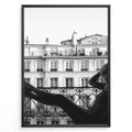 Load image into Gallery viewer, Fashion Plakat | Elegant Woman Relaxing on Parisian Balcony – Black and White Photography Plakaty.dk | Black and white photo of a woman relaxing on a Parisian balcony with classic building architecture in the background