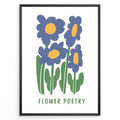 Flower Poetry Plakat | Botanisk Poster | Håndtegnet blå blomsterillustration med gul midte