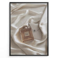 Fashion Plakat | Gabrielle Chanel Perfume on Silk with Envelope – Luxury Flat Lay Print Plakaty.dk | Gabrielle Chanel Essence perfume bottle and Chanel envelope placed on soft ivory silk fabric in a luxury flat lay composition.