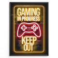 Gaming in Progress gaming plakat | Neon gul og rød plakat med controller og advarselsbudskab – gaming plakater fra Plakaty.dk