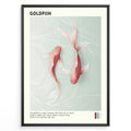 Plakater | Digital illustration of two pinkish-orange goldfish swimming in clear water with subtle wave patterns, framed in black with the title "GOLDFISH" and descriptive text below.