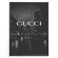 Fashion Plakat | Gucci Cityscape Black & White Fashion Poster Plakaty.dk | Black and white poster with the Gucci logo over a night cityscape featuring tall buildings and water reflections.