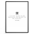 Fashion Plakat | Inspirational Coco Chanel Quote Wall Art Plakaty.dk | Black and white framed print with the quote “If you want to be original, be ready to be copied” by Coco Chanel, featuring the Chanel logo.