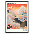 Japanske plakater | Abstract Japanese art print titled "Japanese Fields" with flowing wave patterns in red, blue, and gold tones, representing Tokyo, framed in black.
