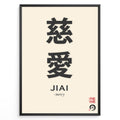 Japanske plakater | Minimalist Japanese wall art featuring the Kanji characters for "JIAI" (mercy), with the English translation and traditional red seals on a cream background.