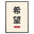 Japanske plakater | Minimalist poster with Japanese kanji characters for "Hope" and a red stamp at the bottom reading "Kibo" on a cream background.