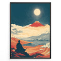 Japanske plakater | Japanese art print of a meditating person facing Mount Fuji under a full moon, surrounded by waves, clouds, and warm red-orange landscapes, framed in black.