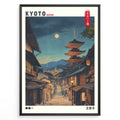 Load image into Gallery viewer, Japanske plakater | Nighttime illustration of Kyoto’s historic street with Yasaka Pagoda (Hōkanji Temple) under a full moon, framed by traditional wooden buildings.