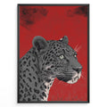 Illustrated leopard portrait with detailed spots and green eyes on a textured red background, framed in black.