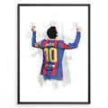 Plakat of Lionel Messi wearing Barcelona number 10 jersey, celebrating with arms raised.