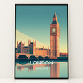 London Vintage Travel Plakat | Vintage Travel Poster | Denne plakat viser en stiliseret illustration af Big Ben og Parlamentsbygningerne i London, England, med deres refleksion i vandet nedenfor. Perfekt til rejse- og arkitekturentusiaster.