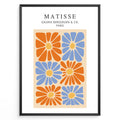 Floral Grid Plakat | Matisse Poster | Stiliserede orange og blå blomster arrangeret i et grafisk mønster