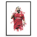 Watercolor-style framed plakat of Mohamed Salah celebrating in a Liverpool FC jersey