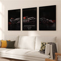 Load image into Gallery viewer, Triptych wall art plakat of the MoneyGram Haas F1 Team VF-24 Formula 1 car displayed in a modern black leather-furnished living room.
