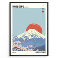 Load image into Gallery viewer, Japanske plakater | Japanese-style poster of Mount Fuji with a red sun in the background and cherry blossoms in the foreground, featuring the text "Honshu Japan" and "Mount Fuji."