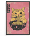 Load image into Gallery viewer, Japanske plakater | Illustration of a cute orange tabby cat eating ramen with chopsticks against a pink background in a Japanese pop art style.