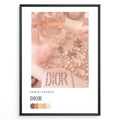 Fashion Plakat | Parisian Luxury Flat Lay – Dior & Chanel Pink Aesthetic Plakaty.dk | Flat lay image with Miss Dior perfume, Chanel pearl necklaces, pink accessories, and a soft pink color palette labeled “Paris/France Dior”.