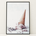 Plakat med isvaffel | Sommer og Strand Plakater | Denne plakat viser en vaffelis, der er væltet og smelter, omgivet af små lavendelfarvede blomster. Perfekt til is- og sommerelskere.
