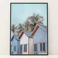 Plakat med strandhuse og palmer | Sommer og Strand Plakater | Denne plakat viser farverige strandhuse med gavltage og palmer i baggrunden. Perfekt til dem, der elsker tropisk atmosfære.