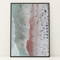 Plakat med strandscene | Sommer og Strand Plakater | Denne plakat viser et luftfoto af en strand med folk, der nyder vandet og sandet. Perfekt til dem, der elsker strandliv.