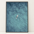 Plakat med surfer på bræt | Sommer og Strand Plakater | Dette luftfoto viser en person på et surfbræt midt i et stort, bølgende blåt-grønt hav. Perfekt til strand- og vandeventyrere.