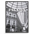 Fashion Plakat | Prada Boutique in Galleria Vittorio Emanuele II – Milan, Italy Plakaty.dk | Black and white photo of the Prada store inside the Galleria Vittorio Emanuele II in Milan, showcasing ornate architecture and a large glass-domed ceiling.