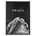 Fashion Plakat | Prada-Inspired Angel Statue – Fashion and Art Black and White Poster Plakaty.dk | Black and white artwork of a mourning angel statue with the word "PRADA" above, blending classical art and modern fashion
