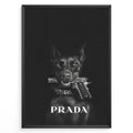 Fashion Plakat | Prada-Inspired Art Featuring Fierce Dog with Gun Plakaty.dk | Black Doberman with a studded collar holding a handgun in its mouth, set against a dark background with the word "PRADA" in bold white text.